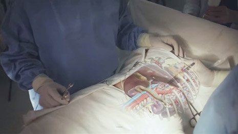 Как это работает? По результатам исследований компьютерной томографии строится индивидуальная анатомическая модель органов пациента. Во время операции бинокулярные видеоочки дополненной реальности Epson Moverio BT-200 и специально разработанное ПО на базе Android накладывают созданную анатомическую 3D-модель на реальный орган в операционном поле. Врач, использующий очки, может выборочно отключать некоторые слои, например, убрать модель органа, оставив только контур и сосуды. Система отслеживает не только положение органа, но и положение самого хирурга, постоянно подстраивая картинку в соответствии с его положением в пространстве и деформацией органа пациента. Кроме того, решения с дополненной реальностью отлично показали себя в визуализации в сфере челюстно-лицевой хирургии.